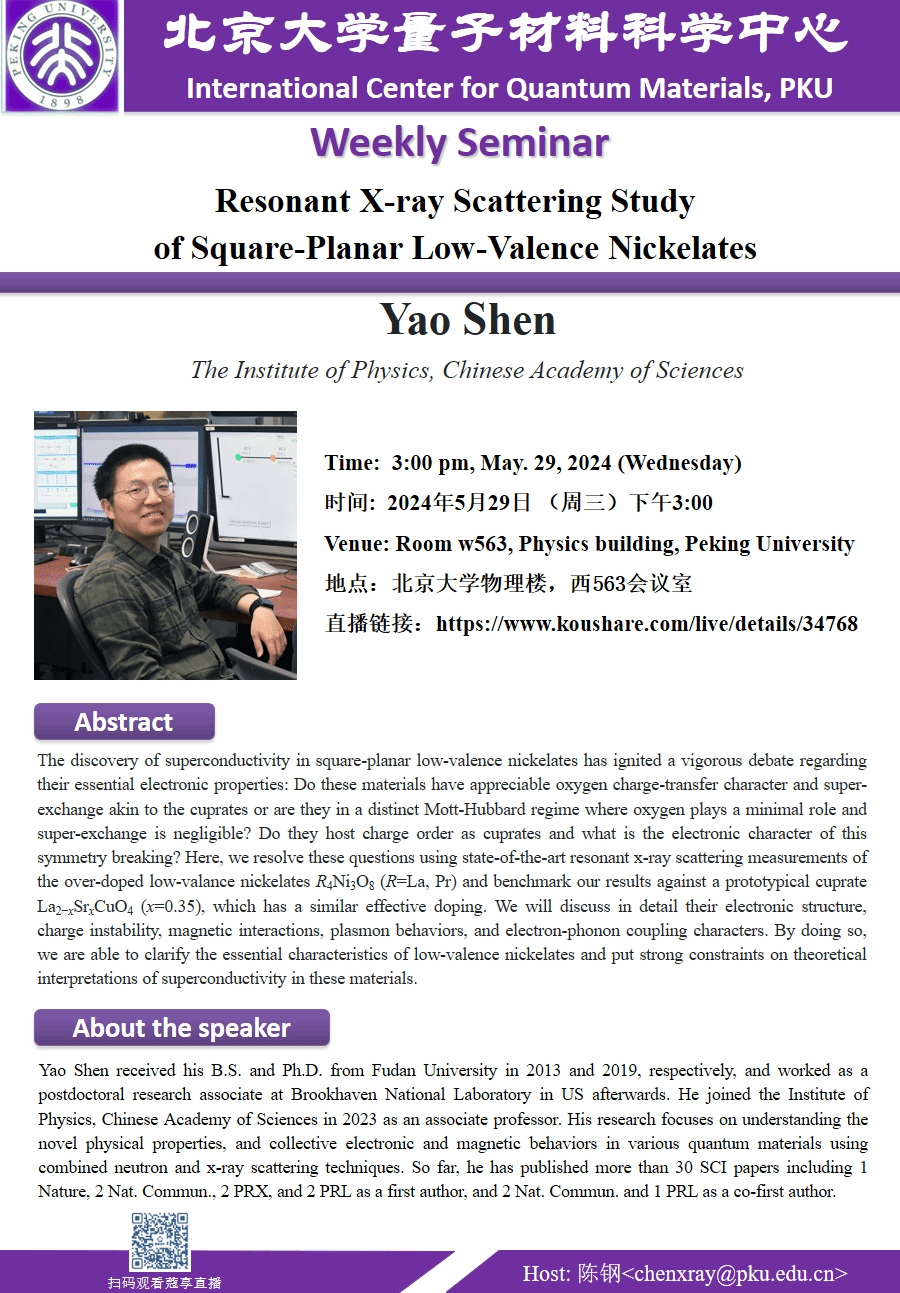 Yao Shen received his B.S. and Ph.D. from Fudan University in 2013 and 2019, respectively, and worked as a postdoctoral research associate at Brookhaven National Laboratory in US afterwards. He joined the Institute of Physics, Chinese Academy of Sciences in 2023 as an associate professor. His research focuses on understanding the novel physical properties, and collective electronic and magnetic behaviors in various quantum materials using combined neutron and x-ray scattering techniques. So far, he has published more than 30 SCI papers including 1 Nature, 2 Nat. Commun., 2 PRX, and 2 PRL as a first author, and 2 Nat. Commun. and 1 PRL as a co-first author.