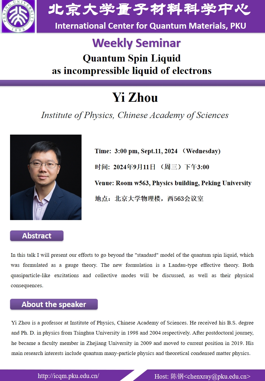Yi Zhou is a professor at Institute of Physics, Chinese Academy of Sciences. He received his B.S. degree and Ph. D. in physics from Tsinghua University in 1998 and 2004 respectively. After postdoctoral journey, he became a faculty member in Zhejiang University in 2009 and moved to current position in 2019. His main research interests include quantum many-particle physics and theoretical condensed matter physics.