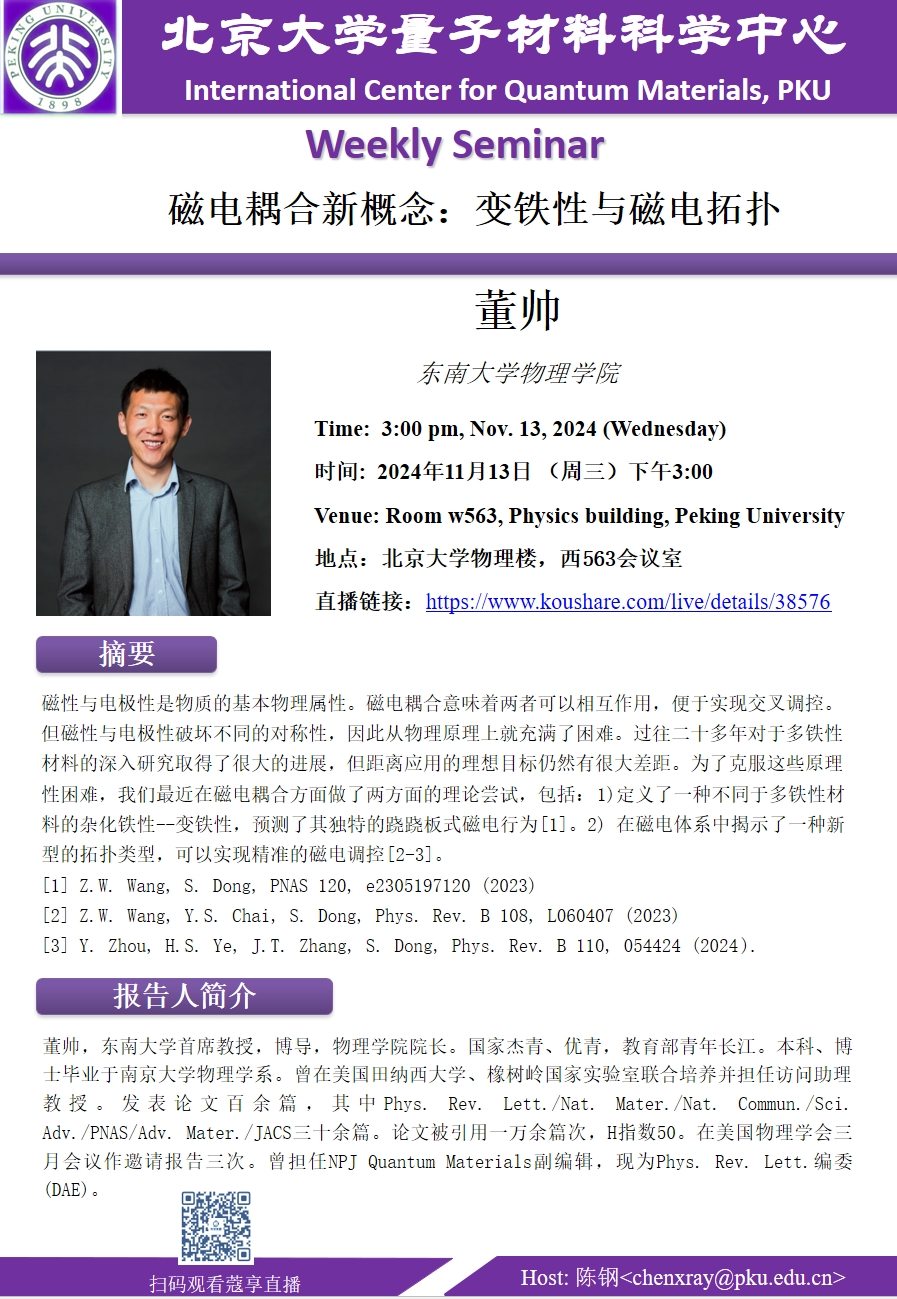董帅,东南大学首席教授,博导,欧冠官方网站院长。国家杰青、优青,教育部青年长江。本科、博士毕业于南京大学物理学系。曾在美国田纳西大学、橡树岭国家实验室联合培养并担任访问助理教授。发表论文百余篇,其中Phys. Rev. Lett./Nat. Mater./Nat. Commun./Sci. Adv./PNAS/Adv. Mater./JACS三十余篇。论文被引用一万余篇次,H指数50。在美国物理学会三月会议作邀请报告三次。曾担任NPJ Quantum Materials副编辑,现为Phys. Rev. Lett.编委(DAE)。