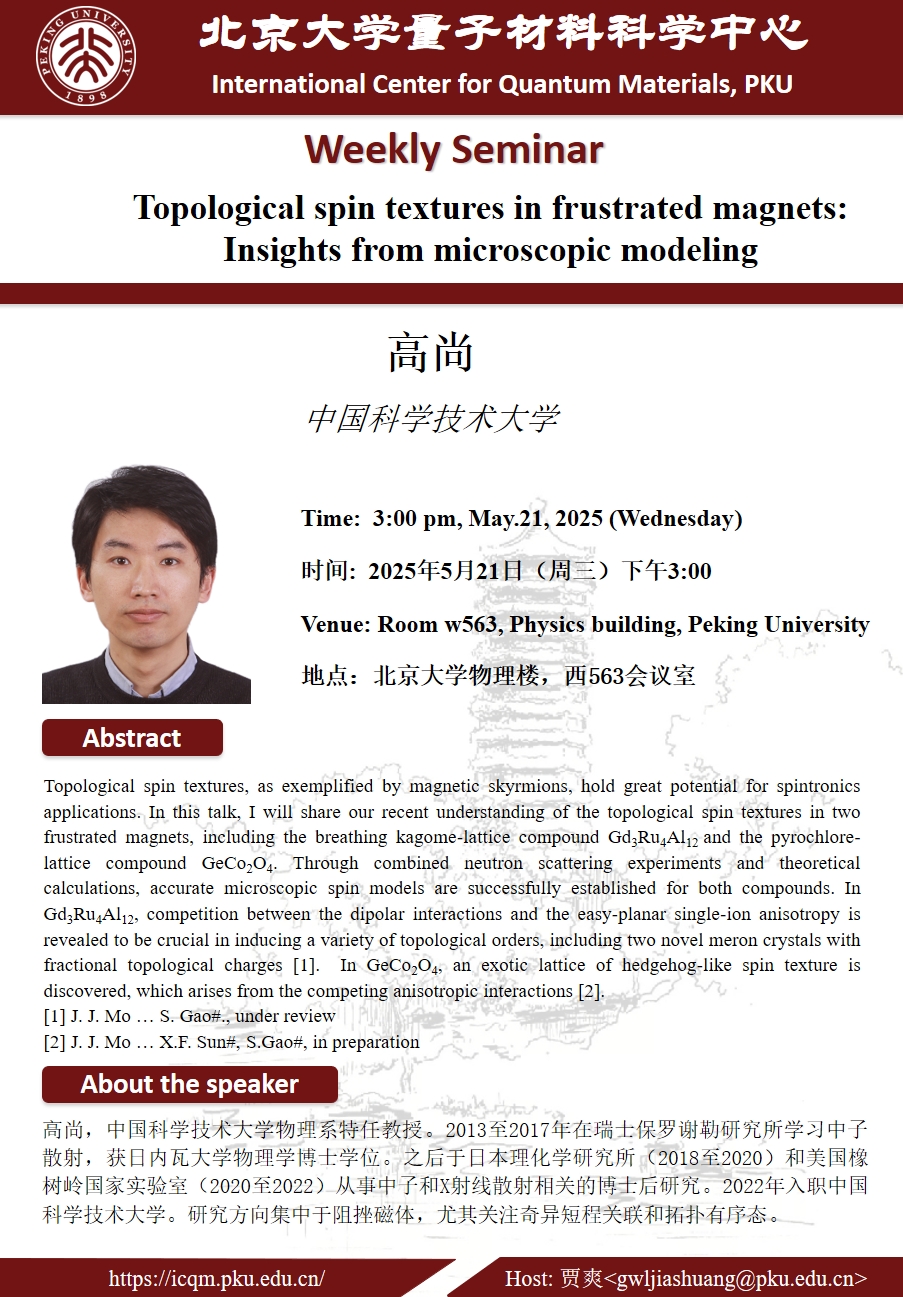 主讲人简介: 高尚,中国科学技术大学物理系特任教授。2013至2017年在瑞士保罗谢勒研究所学习中子散射,获日内瓦大学物理学博士学位。之后于日本理化学研究所(2018至2020)和美国橡树岭国家实验室(2020至2022)从事中子和X射线散射相关的博士后研究。2022年入职中国科学技术大学。研究方向集中于阻挫磁体,尤其关注奇异短程关联和拓扑有序态。
