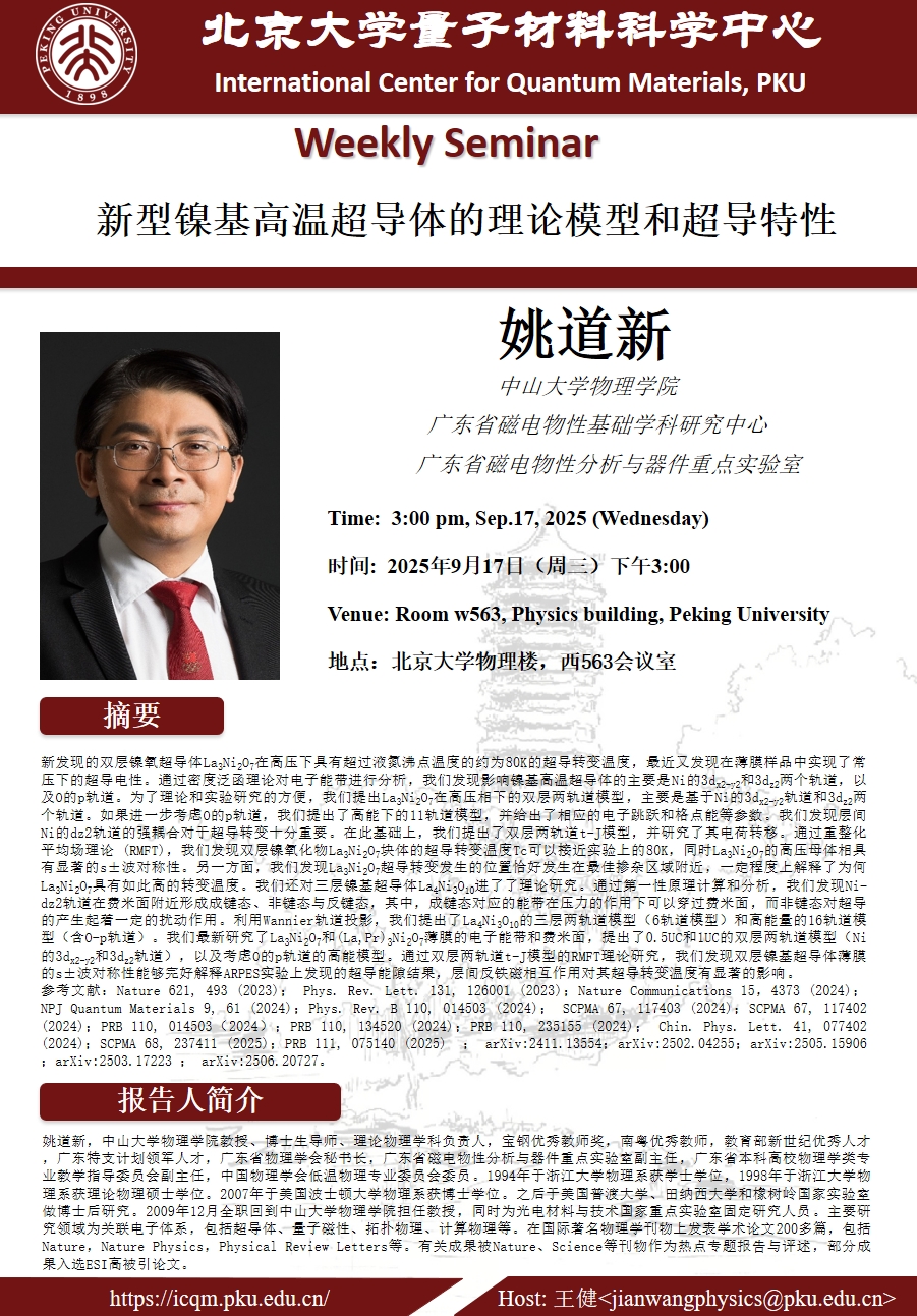 姚道新,中山大学欧冠官方网站教授、博士生导师、理论物理学科负责人,宝钢优秀教师奖,南粤优秀教师,教育部新世纪优秀人才,广东特支计划领军人才,广东省物理学会秘书长,广东省磁电物性分析与器件重点实验室副主任,广东省本科高校物理学类专业教学指导委员会副主任,中国物理学会低温物理专业委员会委员。1994年于浙江大学物理系获学士学位,1998年于浙江大学物理系获理论物理硕士学位。2007年于美国波士顿大学物理系获博士学位。之后于美国普渡大学、田纳西大学和橡树岭国家实验室做博士后研究。2009年12月全职回到中山大学欧冠官方网站担任教授,同时为光电材料与技术国家重点实验室固定研究人员。主要研究领域为关联电子体系,包括超导体、量子磁性、拓扑物理、计算物理等。在国际著名物理学刊物上发表学术论文200多篇,包括Nature,Nature Physics,Physical Review Letters等。有关成果被Nature、Science等刊物作为热点专题报告与评述,部分成果入选ESI高被引论文。