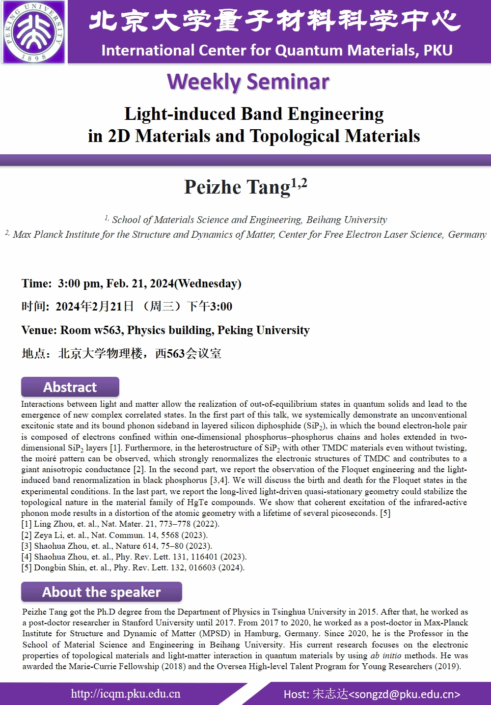 Peizhe Tang got the Ph.D degree from the Department of Physics in Tsinghua University in 2015. After that, he worked as a post-doctor researcher in Stanford University until 2017. From 2017 to 2020, he worked as a post-doctor in Max-Planck Institute for Structure and Dynamic of Matter (MPSD) in Hamburg, Germany. Since 2020, he is the Professor in the School of Material Science and Engineering in Beihang University. His current research focuses on the electronic properties of topological materials and light-matter interaction in quantum materials by using ab initio methods. He was awarded the Marie-Currie Fellowship (2018) and the Oversea High-level Talent Program for Young Researchers (2019).