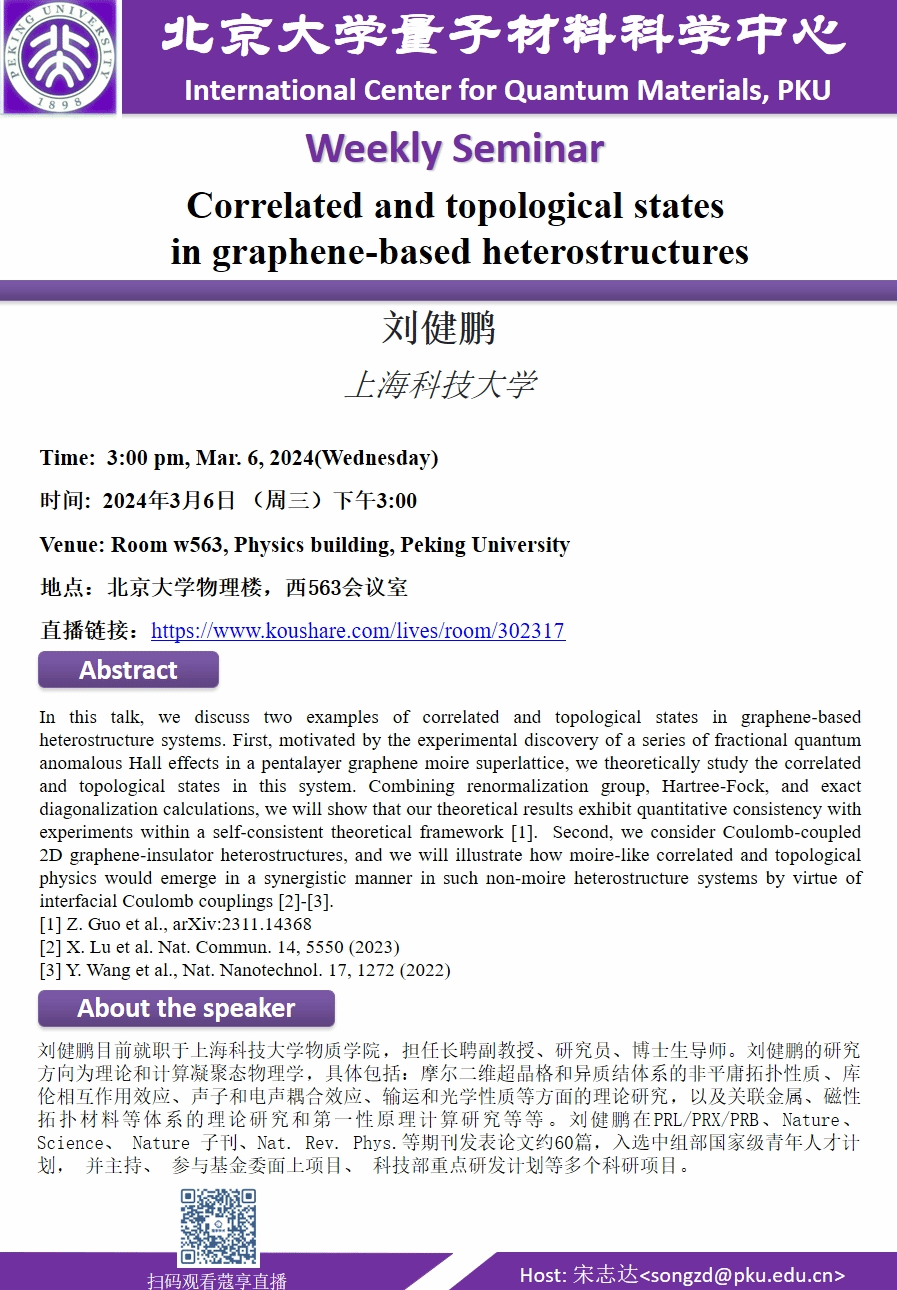 刘健鹏目前就职于上海科技大学物质学院,担任长聘副教授、研究员、博士生导师。刘健鹏的研究方向为理论和计算凝聚态物理学,具体包括:摩尔二维超晶格和异质结体系的非平庸拓扑性质、库伦相互作用效应、声子和电声耦合效应、输运和光学性质等方面的理论研究,以及关联金属、磁性拓扑材料等体系的理论研究和第一性原理计算研究等等。刘健鹏在PRL/PRX/PRB、Nature、 Science、 Nature 子刊、Nat. Rev. Phys.等期刊发表论文约60篇,入选中组部国家级青年人才计划, 并主持、 参与基金委面上项目、 科技部重点研发计划等多个科研项目。