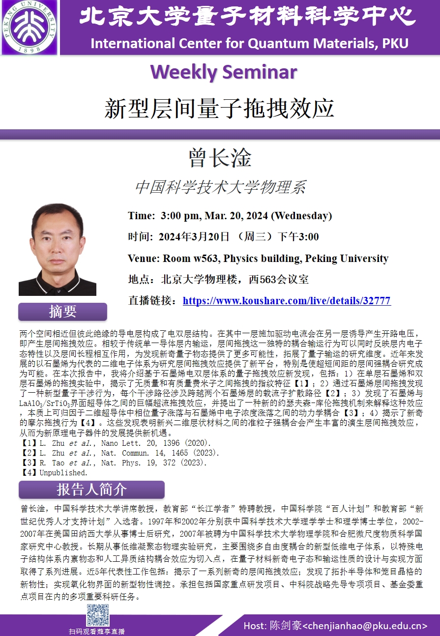 曾长淦,中国科学技术大学讲席教授,教育部“长江学者”特聘教授,中国科学院“百人计划”和教育部“新世纪优秀人才支持计划”入选者。1997年和2002年分别获中国科学技术大学理学学士和理学博士学位,2002-2007年在美国田纳西大学从事博士后研究,2007年被聘为中国科学技术大学欧冠官方网站和合肥微尺度物质科学国家研究中心教授。长期从事低维凝聚态物理实验研究,主要围绕多自由度耦合的新型低维电子体系,以特殊电子结构体系内禀物态和人工异质结构耦合效应为切入点,在量子材料新奇电子态和输运性质的设计与实现方面取得了系列进展。近5年代表性工作包括:揭示了一系列新奇的层间拖拽效应;发现了拓扑半导体和笼目晶格的新物性;实现氧化物界面的新型物性调控。承担包括国家重点研发项目、中科院战略先导专项项目、基金委重点项目在内的多项重要科研任务。