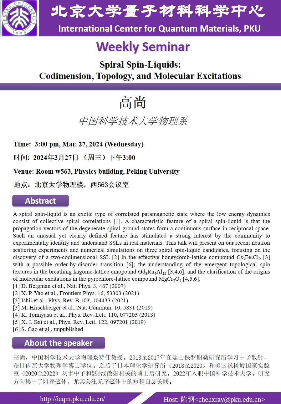 高尚,中国科学技术大学物理系特任教授。2013至2017年在瑞士保罗谢勒研究所学习中子散射,获日内瓦大学物理学博士学位。之后于日本理化学研究所(2018至2020)和美国橡树岭国家实验室(2020至2022)从事中子和X射线散射相关的博士后研究。2022年入职中国科学技术大学。研究方向集中于阻挫磁体,尤其关注无序磁体中的短程自旋关联。