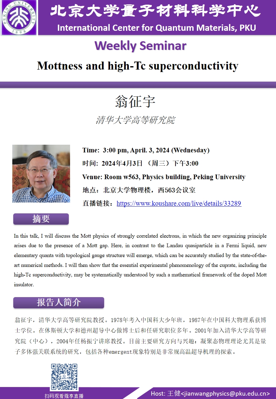 翁征宇,清华大学高等研究院教授。1978年考入中国科大少年班,1987年在中国科大物理系获博士学位。在休斯顿大学和德州超导中心做博士后和任研究职位多年。2001年加入清华大学高等研究院(中心),2004年任杨振宁讲席教授。目前主要研究方向与兴趣:凝聚态物理理论尤其是量子多体强关联系统的研究,包括各种emergent现象特别是非常规高温超导机理的探索。