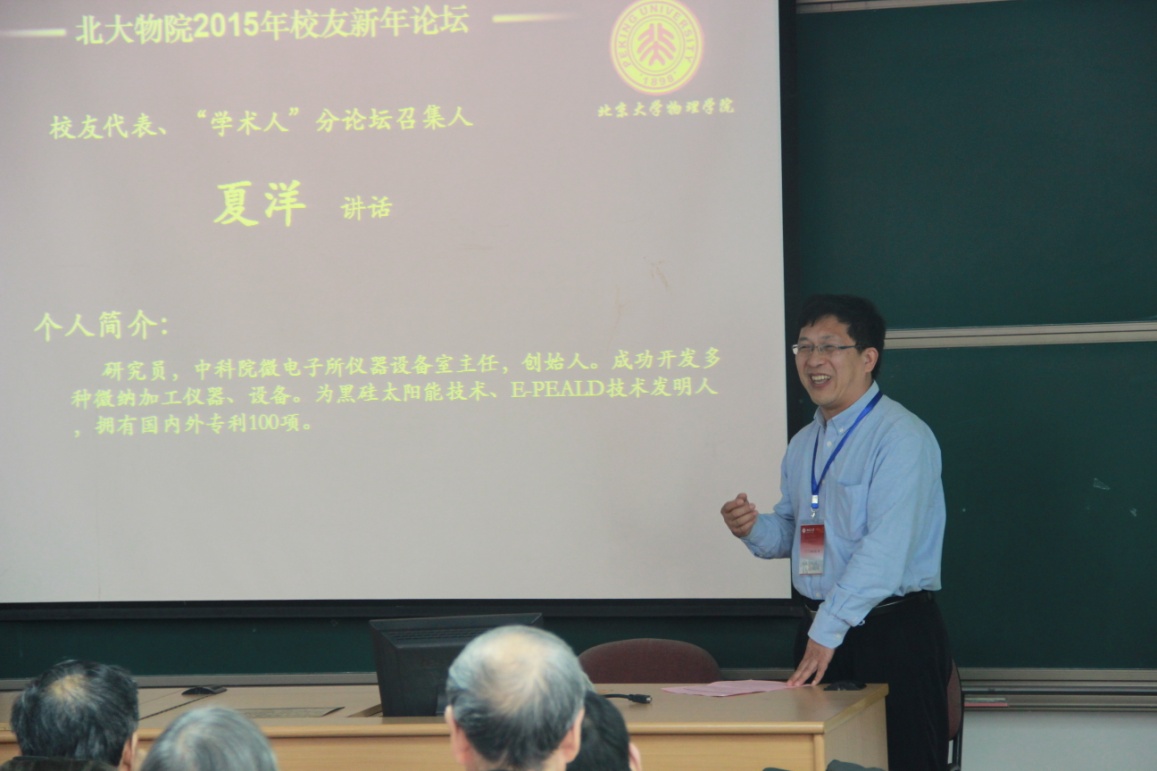 校友代表、“学术人”分论坛召集人、79级物理系夏洋讲话。夏洋学长首先对学院以及学院的各位老师表示感谢,他表示学院的培养使他拥有扎实的物理基础和不懈的创新精神,给予他对待科研工作的无尽热情。学长简要介绍了自己的从业经历,强调虽然多次更换工作,但是从未停止一线科研,目前的主要工作是科学仪器研发和制造。他向校友们介绍下午分论坛的报告内容,并邀约更多校友参会交流。