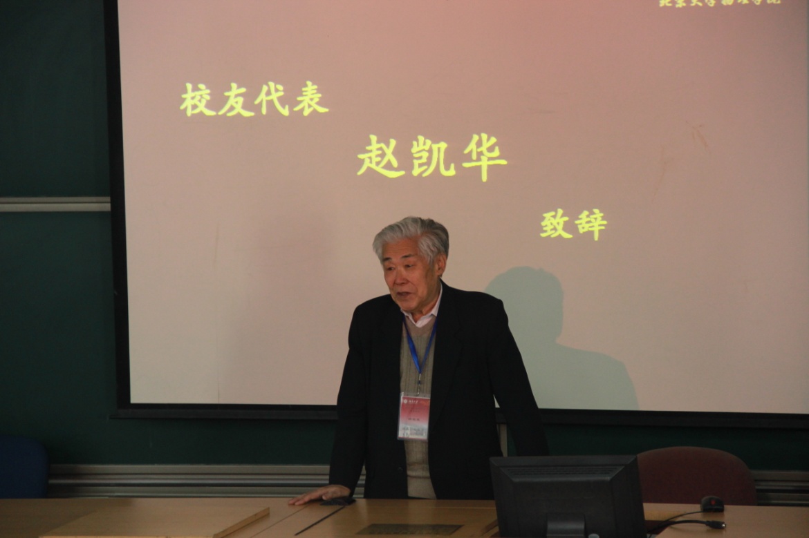 46级物理系赵凯华老师作为校友代表讲话。赵老师对本届校友新年论坛的召开表示支持,他希望今后每年都能举办校友新年论坛,不断增强校友们对学院的归属感和认同感。谈及校庆,赵老师还与大家分享了档案中有关北大校庆日的详细记载,北大前身京师大学堂1898年12月31日首次开学,八国联军期间停课,1912年12月17日正式复课,因此12月17日最早被定为校庆日。