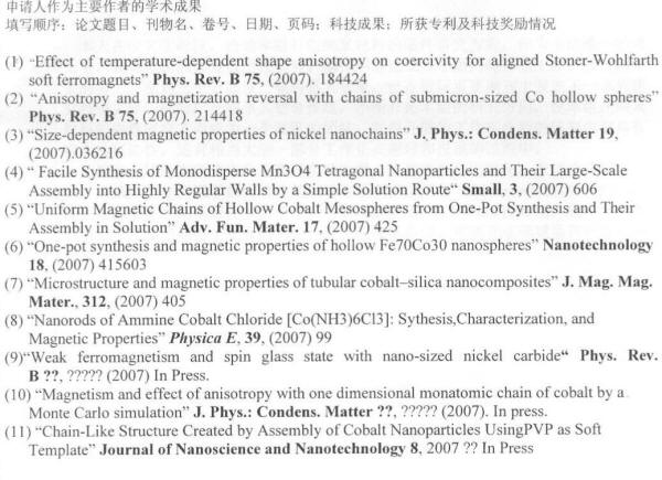 获奖人何林,在研究生阶段,恰逢其组开创纳米材料的磁性研究方向,作为组中唯一的博士生,与其他成员在实验,模拟和理论三方个面同时开展工作,经过两年多的努力,在这三个方面皆已获得重大成果。在开展科研的两年里,已在国际重要期刊上发表了一系列研究科研文章,其中被接收的SCI文章11篇。且都是具有重大国际影响的期刊,如Phys. Rev. B, J. Phys.: Condens. Matter, Small, Adv. Fun. Mater.和Nanotechnology。同时广泛联系其他合作组,不断开拓本组的研究方向,使本组在纳米材料的磁性研究方向成为一个活跃的团队。前期开展的工作在今后的研究中都具有很大的延续性,还有相当大的一部分工作正在整理和投稿的过程中。