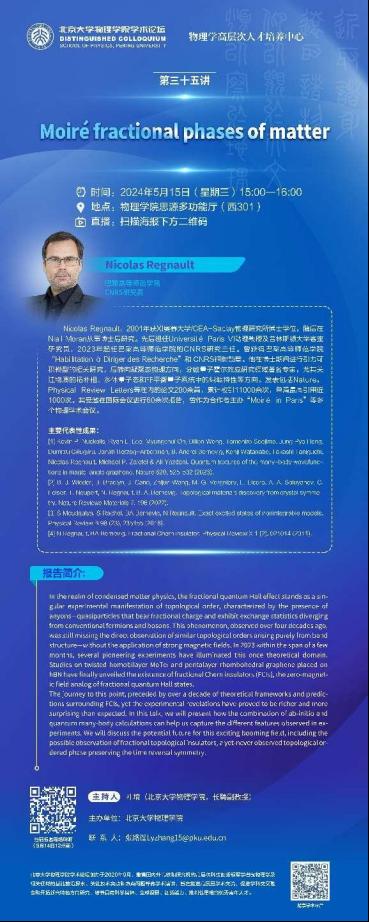 Nicolas Regnault,2001年获XI奥赛大学/CEA-Saclay物理研究所博士学位,随后在Niall Moran从事博士后研究。先后担任Université Paris VI助理教授及普林斯顿大学客座研究员,2023年起任巴黎高等师范学院的CNRS研究主任。曾获得巴黎高等师范学院“Habillitation à Diriger des Recherche”和 CNRS铜牌勋章。他在博士期间进行引力可积模型的相关研究,后转向凝聚态物理方向,是分数量子霍尔效应研究领域著名专家,尤其关注物质的拓扑相、多体量子态和非平衡量子系统中的纠缠特性等方向。发表包括Nature,Physical Review Letters等在内的论文200余篇,累计被引11000余次,单篇最高引用近1000次。其受邀在国际会议进行60余次报告,曾作为合作者主办“Moiré in Paris”等多个物理学术会议。