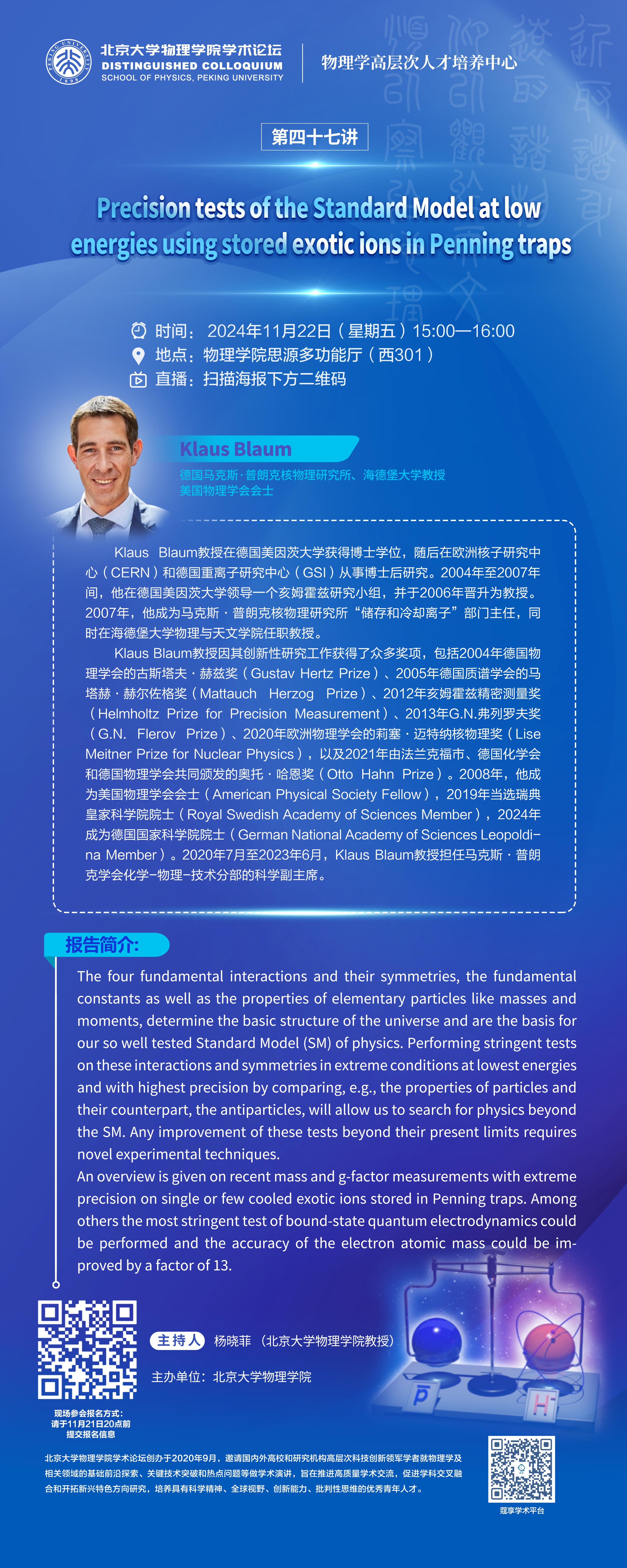 Klaus Blaum教授在德国美因茨大学获得博士学位,随后在欧洲核子研究中心(CERN)和德国重离子研究中心(GSI)从事博士后研究。2004年至2007年间,他在德国美因茨大学领导一个亥姆霍兹研究小组,并于2006年晋升为教授。2007年,他成为马克斯·普朗克核物理研究所“储存和冷却离子”部门主任,同时在海德堡大学物理与天文学院任职教授。