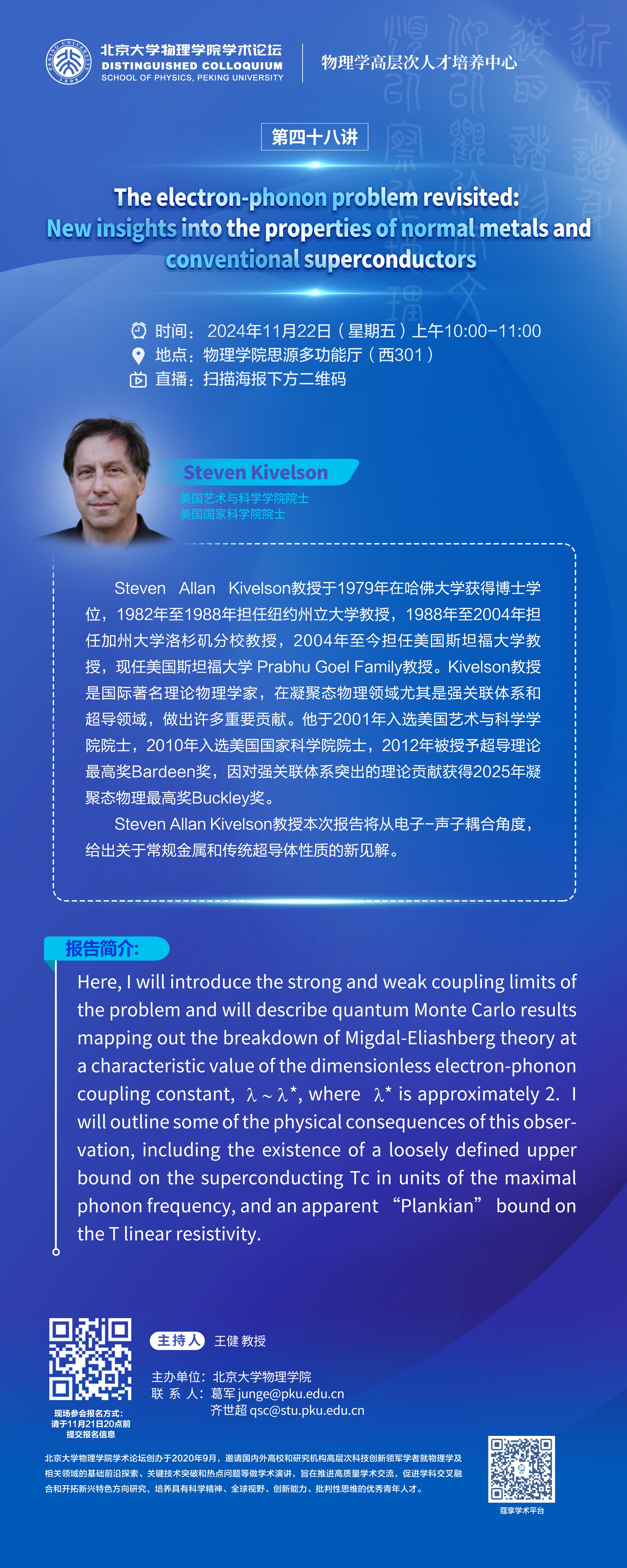 Steven Allan Kivelson教授本次报告将从电子-声子耦合角度,给出关于常规金属和传统超导体性质的新见解。