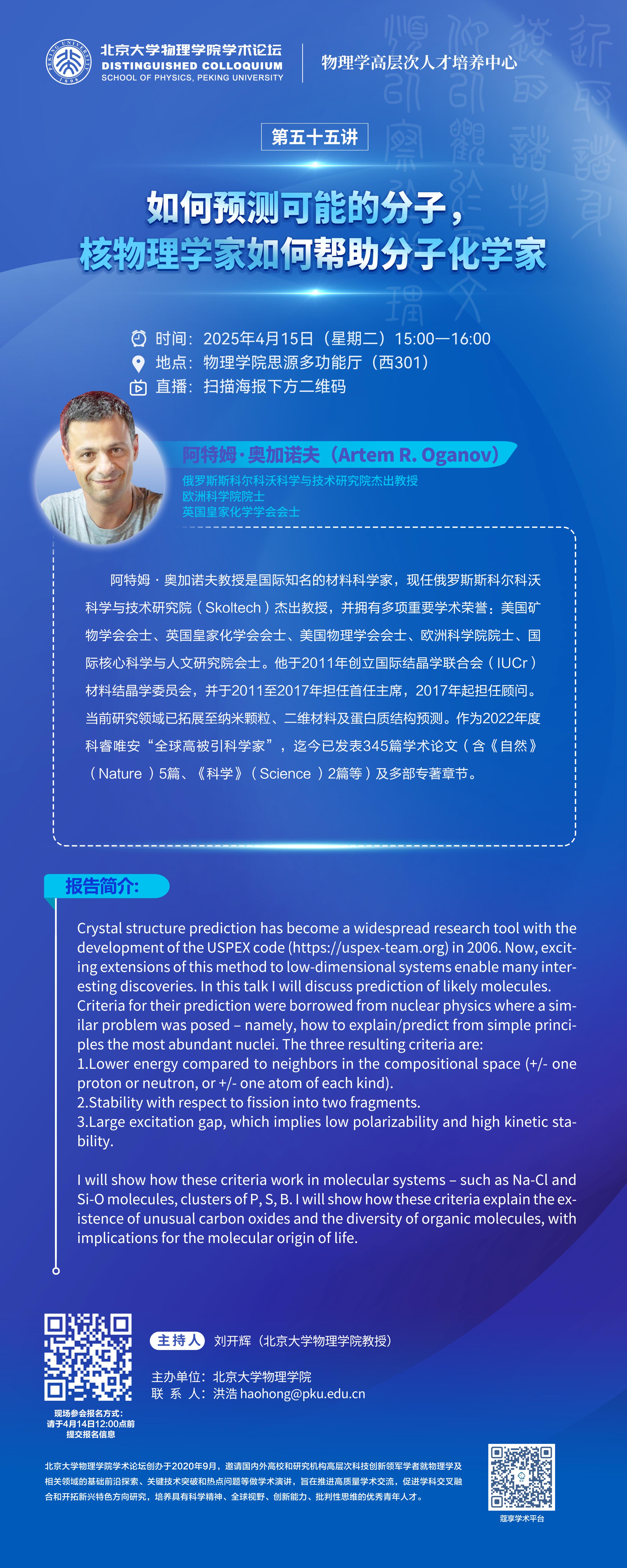 阿特姆·奥加诺夫教授是国际知名的材料科学家,现任俄罗斯斯科尔科沃科学与技术研究院(Skoltech)杰出教授,并拥有多项重要学术荣誉:美国矿物学会会士、英国皇家化学会会士、美国物理学会会士、欧洲科学院院士、国际核心科学与人文研究院会士。他于2011年创立国际结晶学联合会(IUCr)材料结晶学委员会,并于2011至2017年担任首任主席,2017年起担任顾问。当前研究领域已拓展至纳米颗粒、二维材料及蛋白质结构预测。作为2022年度科睿唯安“全球高被引科学家”,迄今已发表345篇学术论文(含《自然》(Nature )5篇、《科学》(Science )2篇等)及多部专著章节。