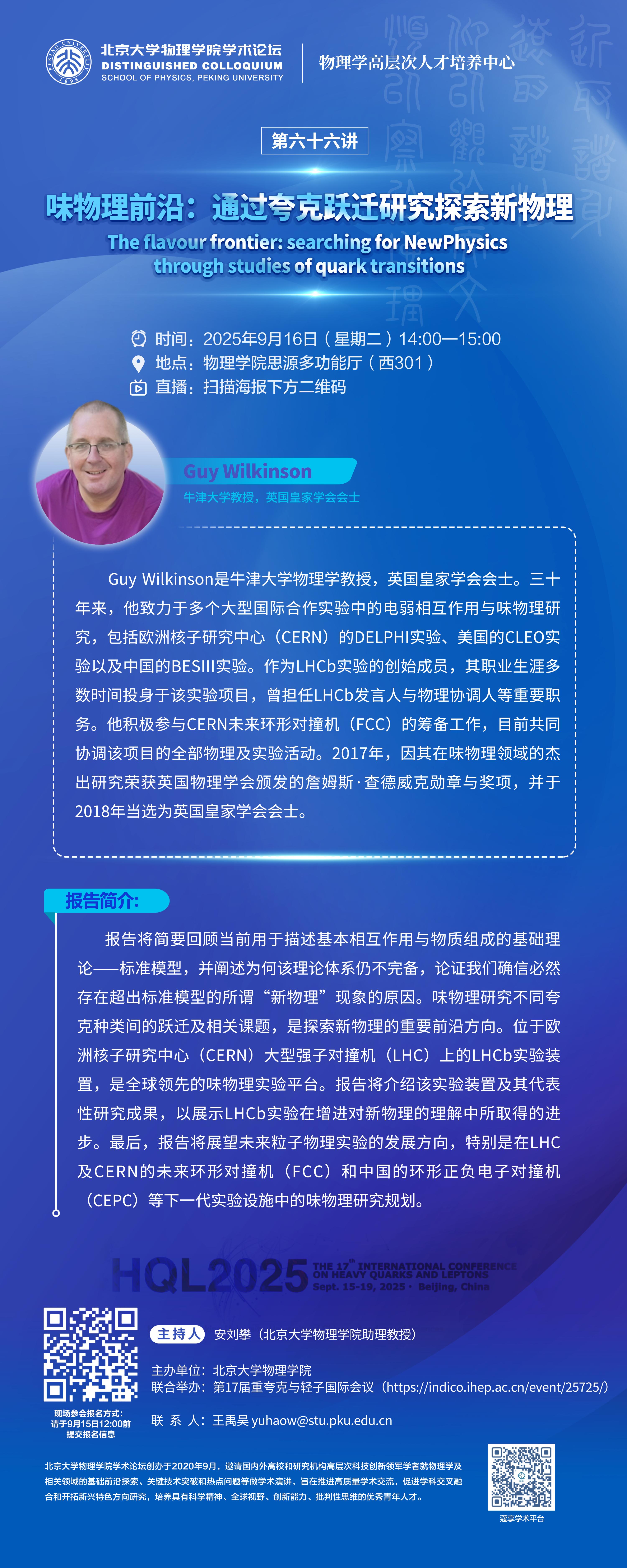 Guy Wilkinson是牛津大学物理学教授,英国皇家学会会士。三十年来,他致力于多个大型国际合作实验中的电弱相互作用与味物理研究,包括欧洲核子研究中心(CERN)的DELPHI实验、美国的CLEO实验以及中国的BESIII实验。作为LHCb实验的创始成员,其职业生涯多数时间投身于该实验项目,曾担任LHCb发言人与物理协调人等重要职务。他积极参与CERN未来环形对撞机(FCC)的筹备工作,目前共同协调该项目的全部物理及实验活动。2017年,因其在味物理领域的杰出研究荣获英国物理学会颁发的詹姆斯·查德威克勋章与奖项,并于2018年当选为英国皇家学会会士。