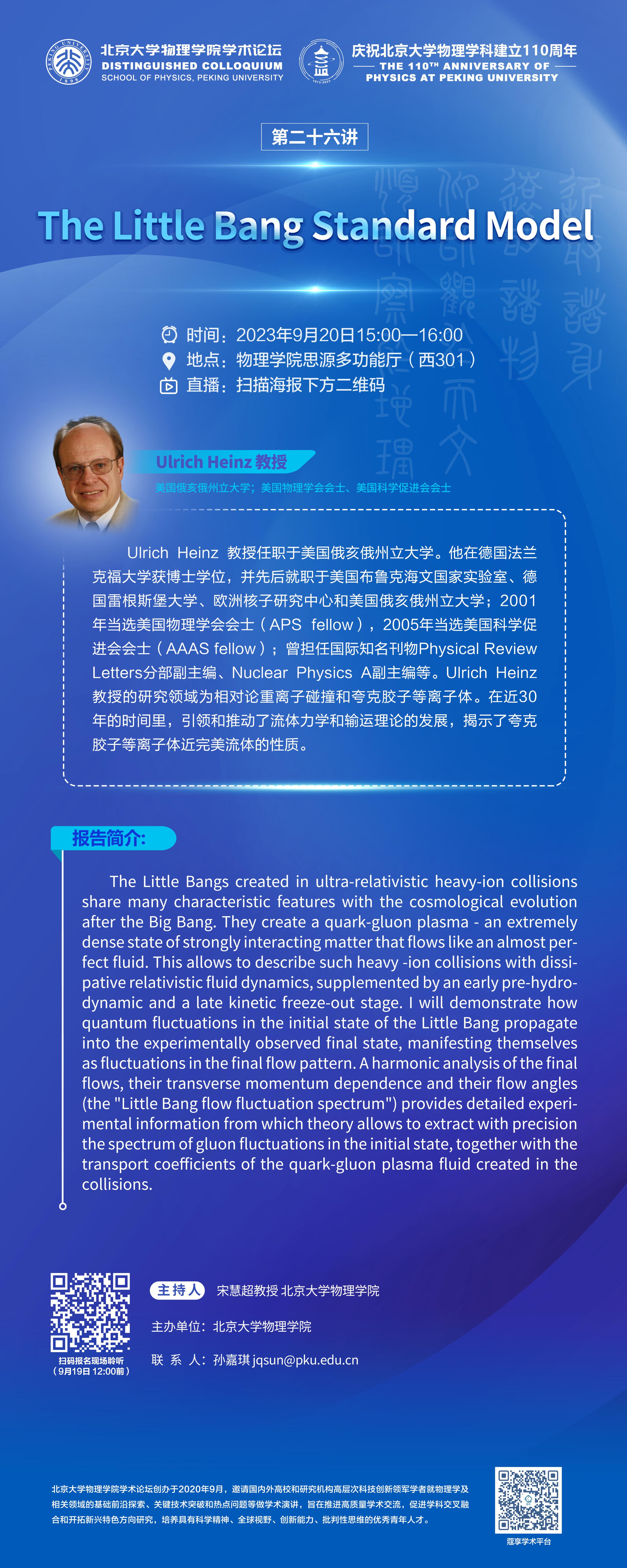 Ulrich Heinz 教授任职于美国俄亥俄州立大学。他在德国法兰克福大学获博士学位,并先后就职于美国布鲁克海文国家实验室、德国雷根斯堡大学、欧洲核子研究中心和美国俄亥俄州立大学;2001年当选美国物理学会会士(APS fellow),2005年当选美国科学促进会会士(AAAS fellow);曾担任国际知名刊物Physical Review Letters分部副主编、Nuclear Physics A副主编等。Ulrich Heinz 教授的研究领域为相对论重离子碰撞和夸克胶子等离子体。在近30年的时间里,引领和推动了流体力学和输运理论的发展,揭示了夸克胶子等离子体近完美流体的性质。