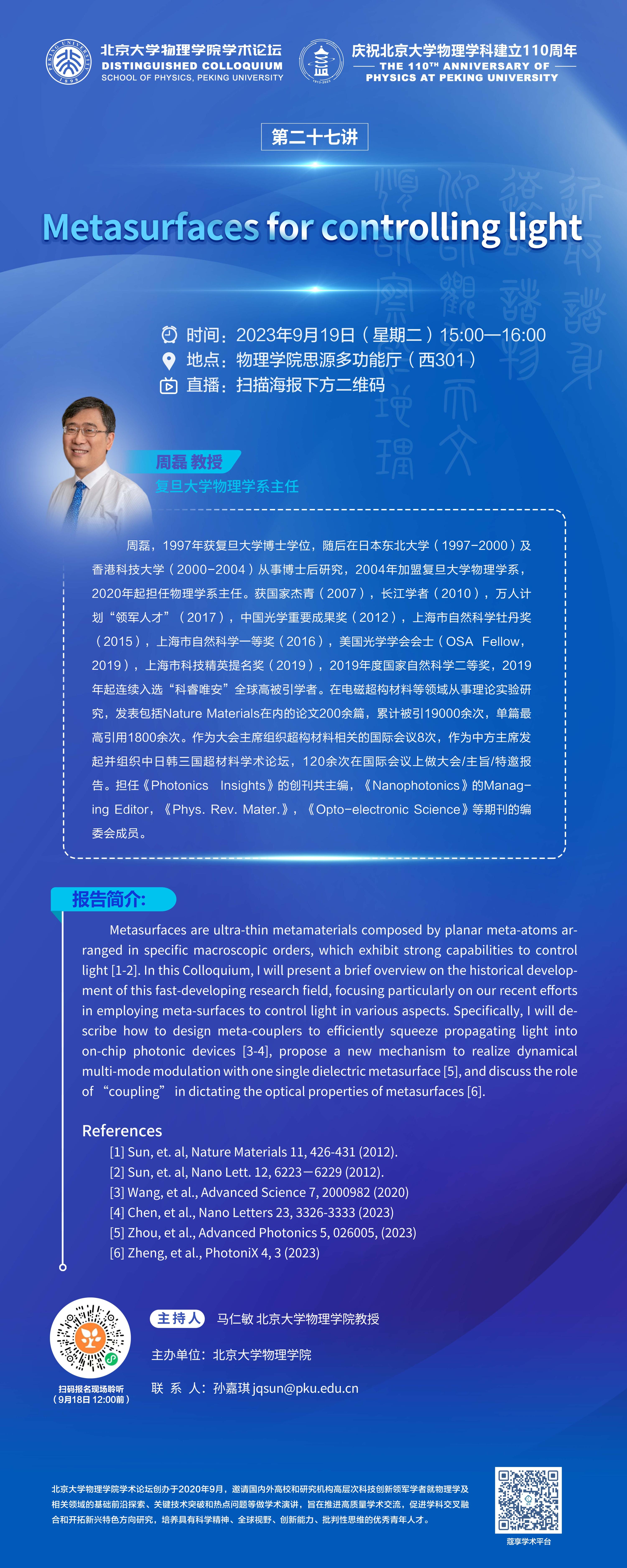 周磊,1997年获复旦大学博士学位,随后在日本东北大学(1997-2000)及香港科技大学(2000-2004)从事博士后研究,2004年加盟复旦大学物理学系,2020年起担任物理学系主任。获国家杰青(2007),长江学者(2010),万人计划“领军人才”(2017),中国光学重要成果奖(2012),上海市自然科学牡丹奖(2015),上海市自然科学一等奖(2016),美国光学学会会士(OSA Fellow,2019),上海市科技精英提名奖(2019),2019年度国家自然科学二等奖,2019年起连续入选“科睿唯安”全球高被引学者。在电磁超构材料等领域从事理论实验研究,发表包括Nature Materials在内的论文200余篇,累计被引19000余次,单篇最高引用1800余次。作为大会主席组织超构材料相关的国际会议8次,作为中方主席发起并组织中日韩三国超材料学术论坛,120余次在国际会议上做大会/主旨/特邀报告。担任《Photonics Insights》的创刊共主编,《Nanophotonics》的Managing Editor,《Phys. Rev. Mater.》,《Opto-electronic Science》等期刊的编委会成员。