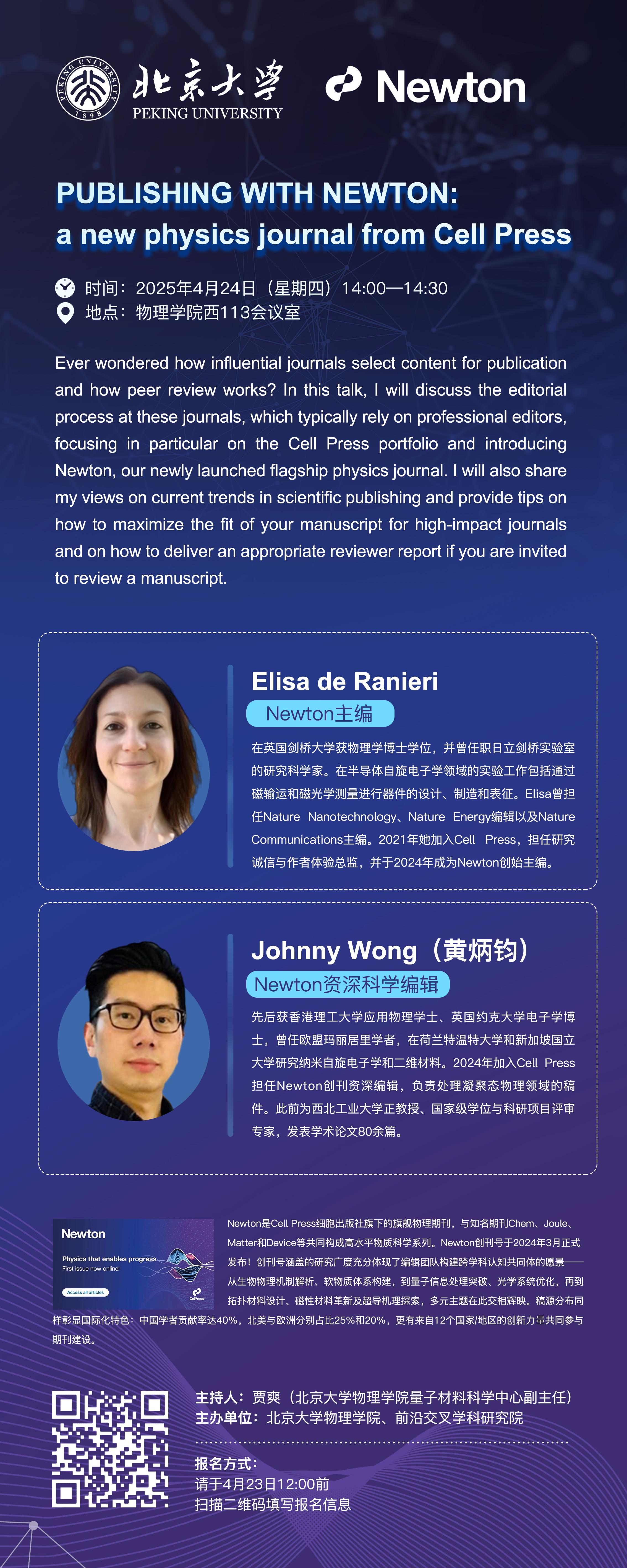 在英国剑桥大学获物理学博士学位,并曾任职日立剑桥实验室的研究科学家。在半导体自旋电子学领域的实验工作包括通过磁输运和磁光学测量进行器件的设计、制造和表征。Elisa曾担任Nature Nanotechnology、Nature Energy编辑以及Nature Communications主编。2021年她加入Cell Press,担任研究诚信与作者体验总监,并于2024年成为Newton创始主编。