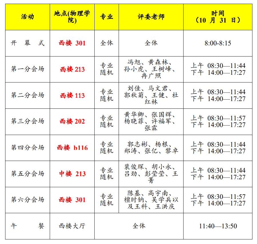 午餐及茶歇 每个会场的评选都分为上下午两场,每场中途会有 15分钟 的茶歇,此次钟盛标论坛受到学院很高的重视,茶歇基本以物院的最高标准对待,由外包公司负责,届时我们会在西楼一楼大厅和二楼中厅各摆一个茶歇台,西113,b116会场选手请就近去一楼大厅,西202,213,301,中213会场选手请就近去二楼中厅品尝各种水果、精美点心等。午餐是在西楼大厅 11点40 开始,我们为大家准备了披萨、糕点、水果等食物,各位可凭餐券自助取用。