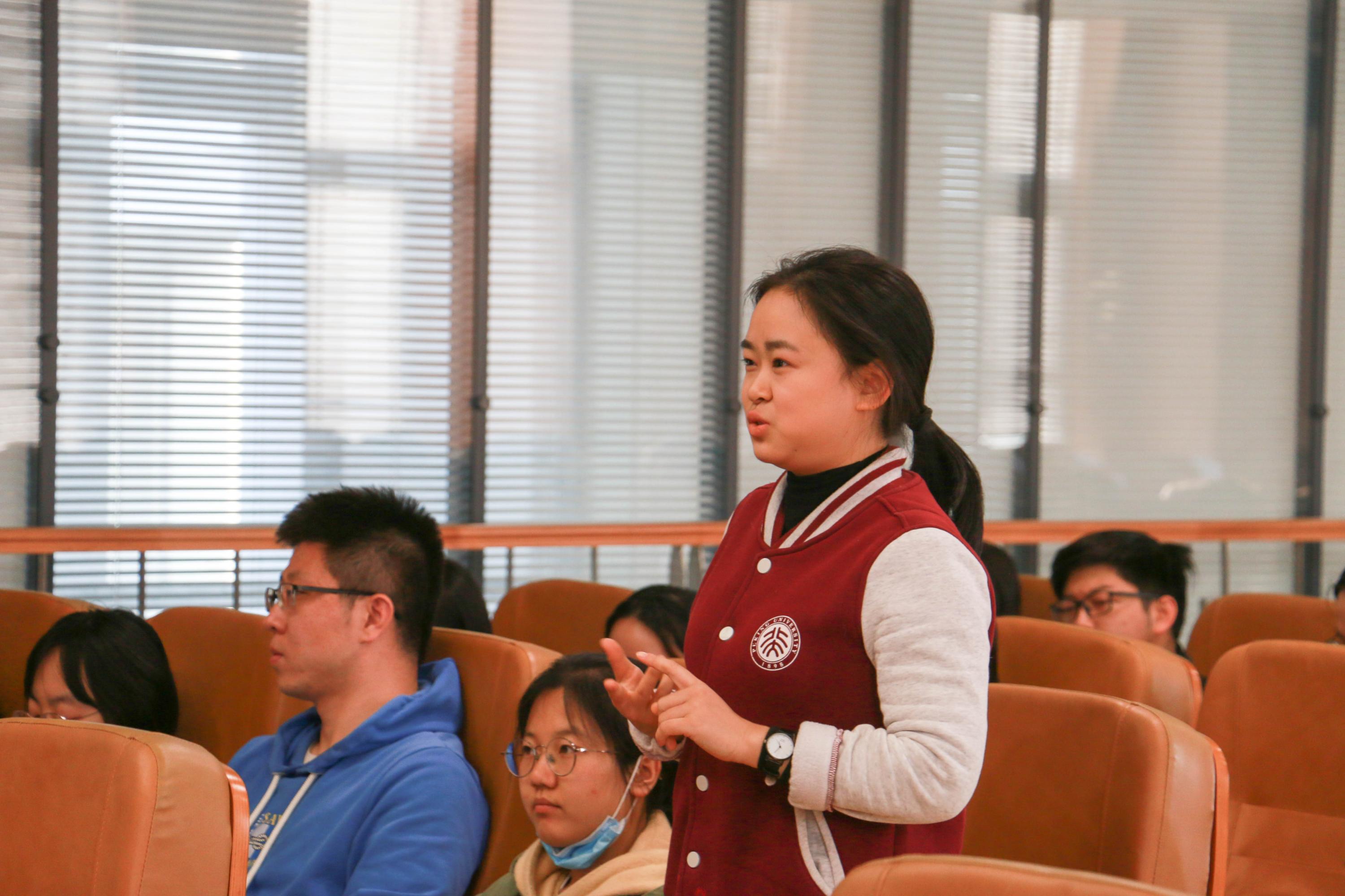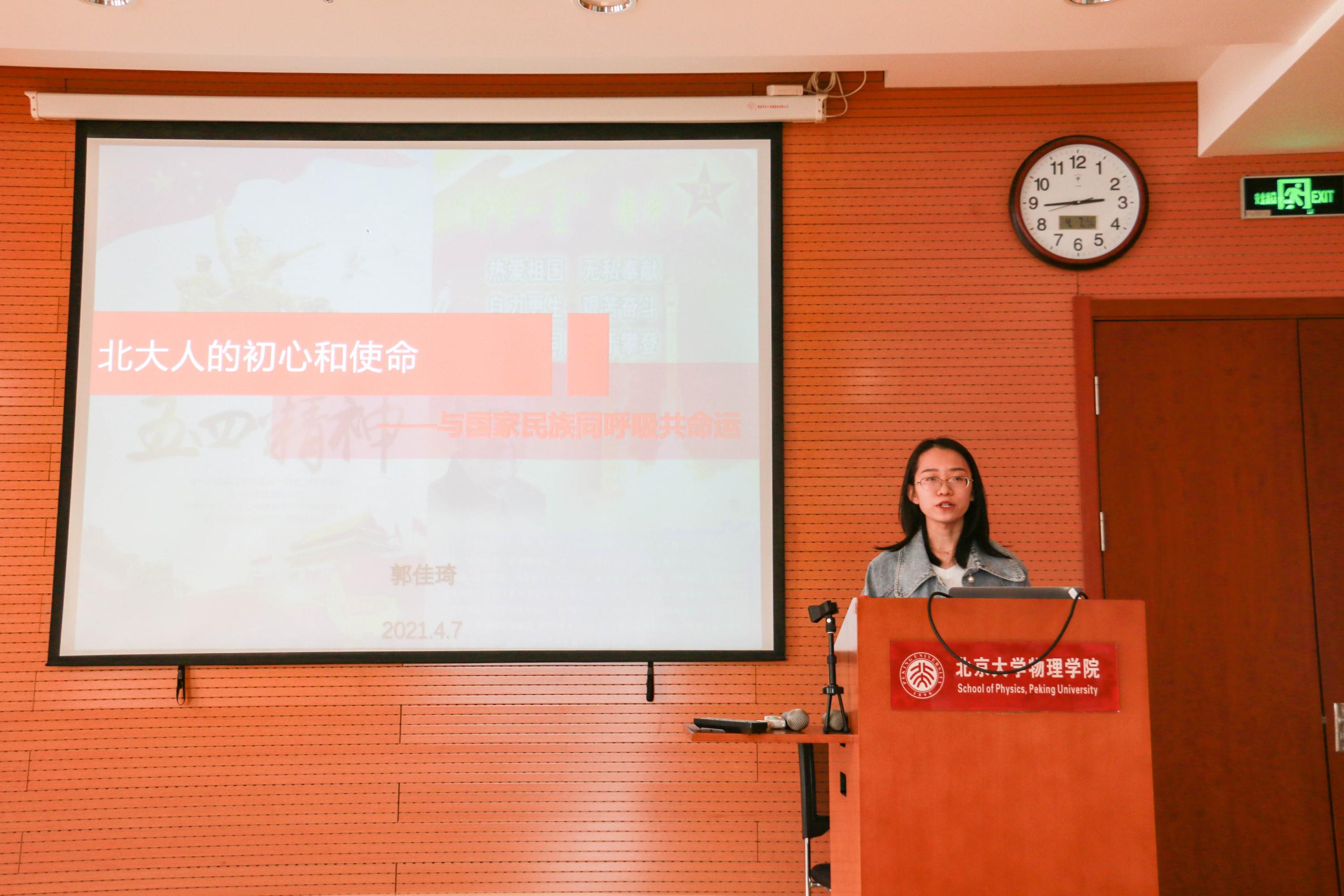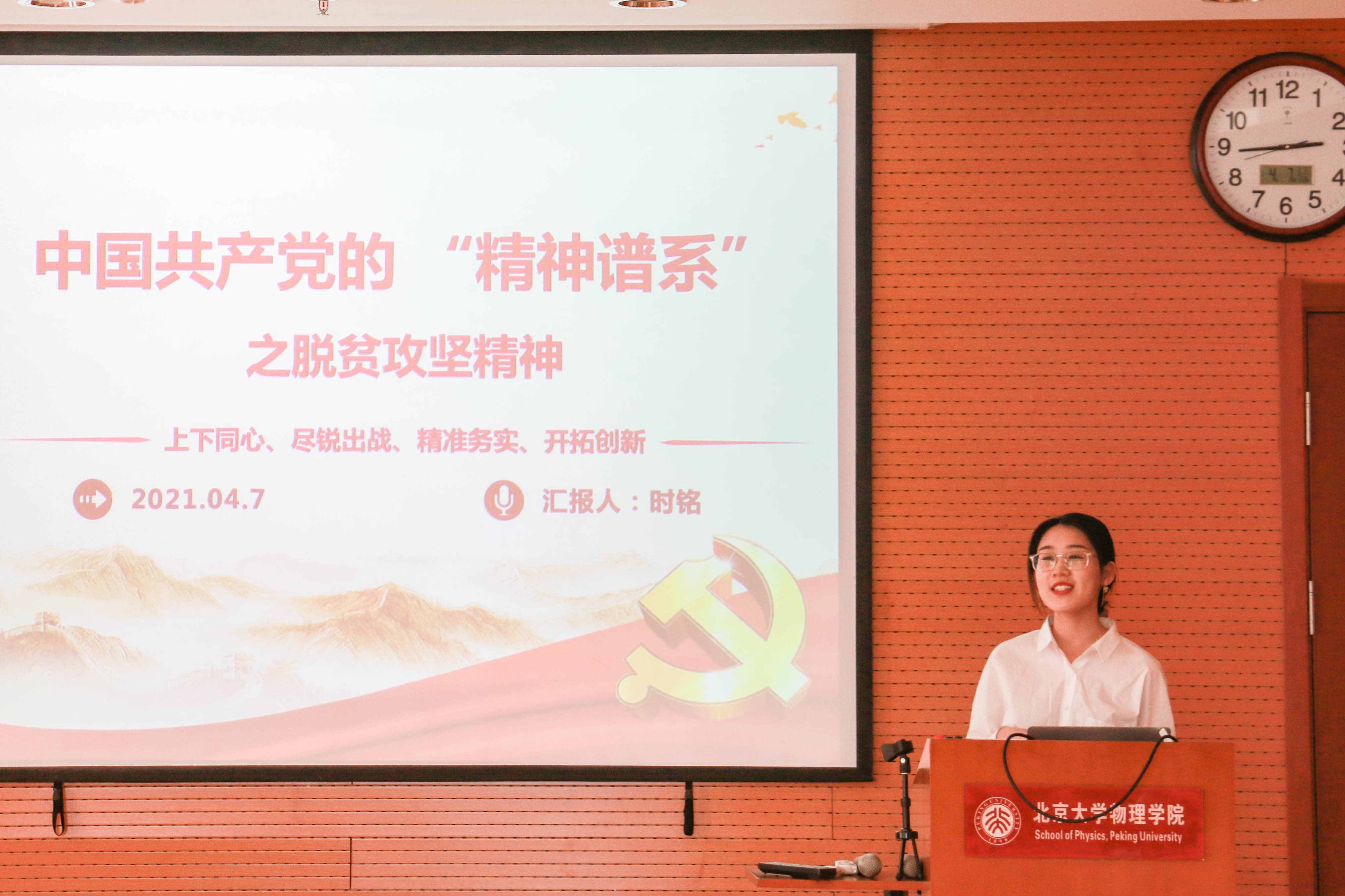 之后,时铭同志做了题为“中国共产党的精神谱系之脱贫攻坚精神”的主题报告,带领大家学习了新时代脱贫攻坚精神及脱贫攻坚楷模的感人事迹。一部中国史,就是一部中华民族同贫困斗争的历史,在过去的2020年,全面建成小康社会取得了伟大历史性成就,决战脱贫攻坚取得了决定性胜利,时铭同志向大家介绍了脱贫攻坚精神的具体内涵、国家为脱贫采取的一系列措施,并用数据和图片向大家展示了国家脱贫攻坚战取得的的成绩。中国的脱贫奇迹离不开脱贫工作者的艰苦奋斗,时铭同志介绍了两位脱贫攻坚楷模的感人事例——黄文秀在北京师范大学研究生毕业后,毅然选择投身家乡的扶贫工作,主动请缨到贫困村担任驻村第一书记,在工作中不幸因公殉职,将自己年轻的生命都奉献给了脱贫攻坚事业;张桂梅,排除万难创办了针对贫困学生的没有门槛的女子高中,建校12年来帮助1800名山区女孩走出了大山,用知识改变了贫困山区女孩的命运……报告的最后,时铭同志分享了鲁迅先生对中国青年的寄语:“愿中国的青年都摆脱冷气,只是向上走,不必听自暴自弃者流的话。做能事的做事,能发生的发声,有一分热,发一分光。” 并鼓励大家,作为新时代的北大青年,要继续传承和发扬五四精神、“两弹一星”精神、脱贫攻坚精神等,为建设社会主义现代化国家,实现中华民族的伟大复兴贡献自己的一份力量,