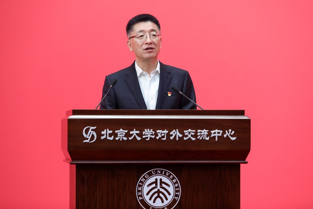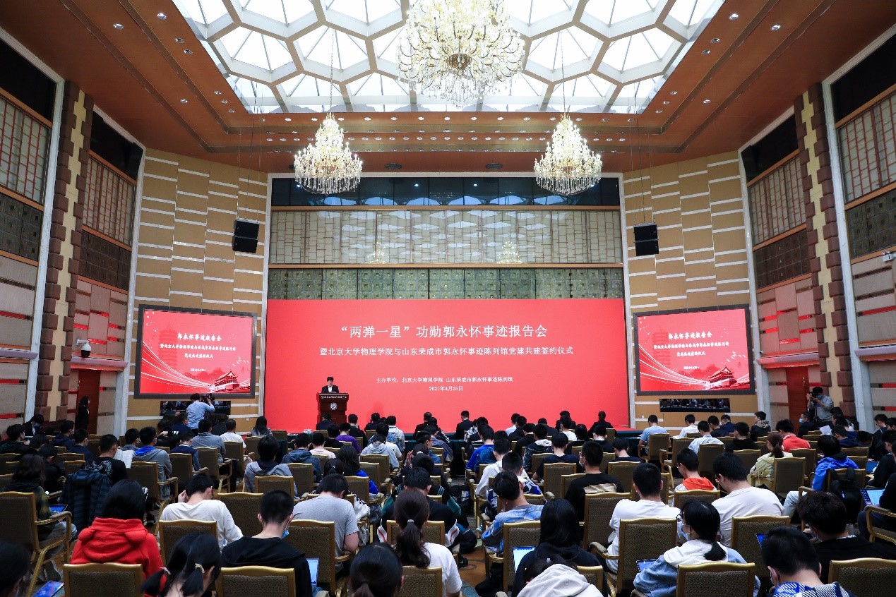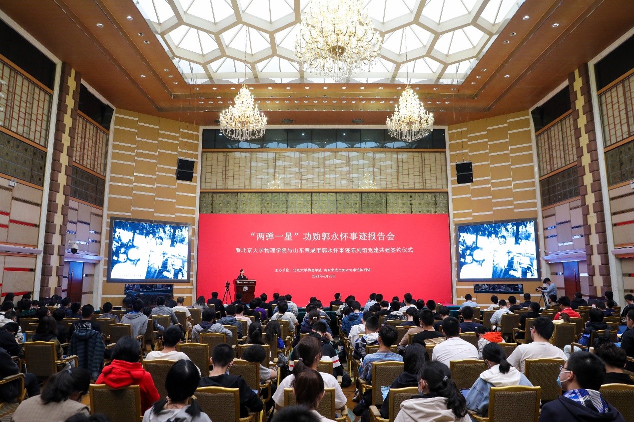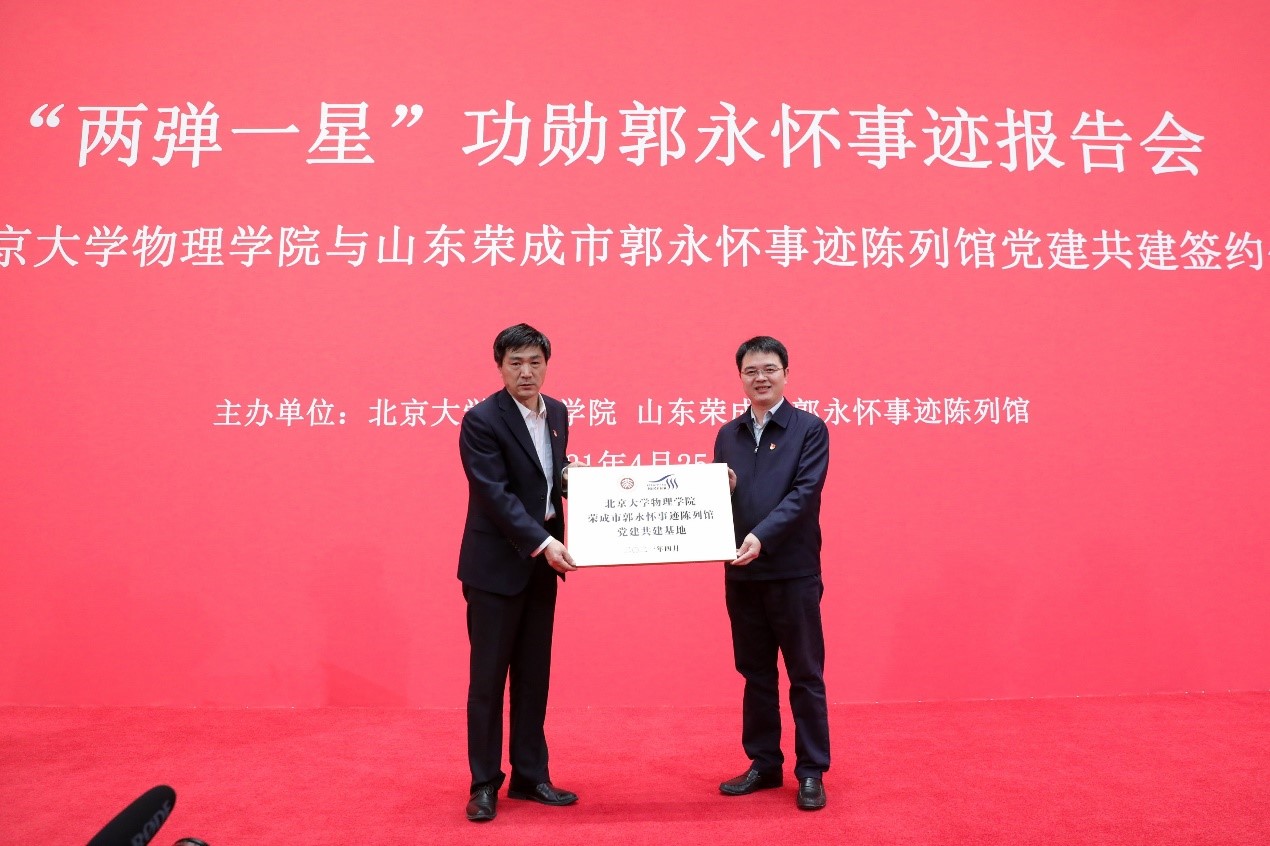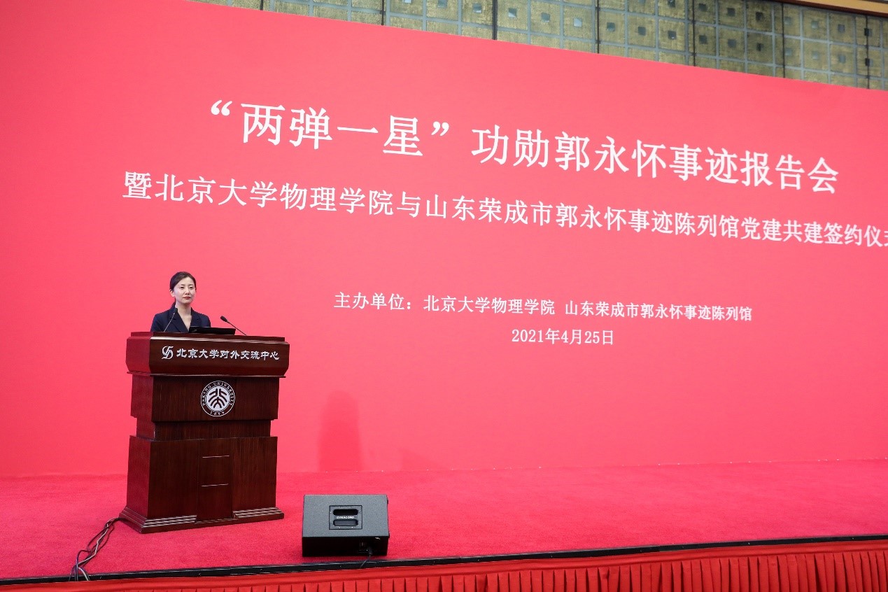 首先,龚旗煌在致辞中回顾了2019年到访荣成市郭永怀事迹陈列馆的经历,表达了对郭永怀先生无私奉献、以身许国的崇高敬意。龚旗煌指出,以郭永怀为代表的广大科技工作者孕育的“两弹一星”精神是中华民族的宝贵精神财富,是中国共产党精神谱系的重要组成部分,也是北大思政教育的鲜活教材,是值得每一位师生传承的红色基因。当前学校正在深入开展党史学习教育,对北大来说,学习党史也是重温校史,也是思考如何在新时代为党和国家作出新的更大贡献。龚旗煌希望同学们立大志、明大德、成大才、担大任,化“两弹一星”精神为不断进取的强大动力,努力成为堪当民族复兴重任的时代新人。