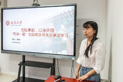 郭永怀先生用他一生的行动向我们诠释了“热爱祖国、无私奉献,自力更生、艰苦奋斗,大力协同、勇于登攀”的“两弹一星”精神。支部同志们认真聆听“学长”郭永怀先生的伟大事迹,他的精神使同学们深受感动。大家表示,郭永怀先生的事迹正如其名,将永远被我们铭记和学习。同为北大物理学子,我们将充分学习和发扬先辈们的爱国红色基因和科学理性思维,刻苦努力,艰苦奋斗,胸怀祖国,服务人民。最后,田晓青同志呼吁支部同志和广大科技工作者一起,不忘初心、牢记使命,秉持国家利益和人民利益至上,继承和发扬老一辈科学家胸怀祖国、服务人民的优秀品质,弘扬两弹一星精神,主动肩负起历史重任,把自己的科学追求融入建设社会主义现代化国家的伟大事业中。