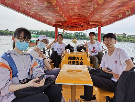 所有同学还分组泛舟北海,在泛舟的同时,大家唱起了耳熟能详的儿歌《让我们荡起双桨》。作为电影《祖国的花朵》的主题曲,这也是同学们小学时学习过的课文。多年过去,同学们在这个时代再度唱响这首歌,心中似乎又涌起了曾经那份澎湃的激情、那份稚嫩的初心。当唱到“我问你亲爱的伙伴,谁给我们安排下幸福的生活”一句时,大家会心一笑,2021年正值中国共产党建党100周年,同学们内心的幸福感和自豪感以及对党的热爱就是最好的献礼。有一组同学还和一位本地老奶奶一同乘船,老奶奶给同学们讲述“仿膳”的前世今生,大家对北海公园的历史也有了进一步的了解。