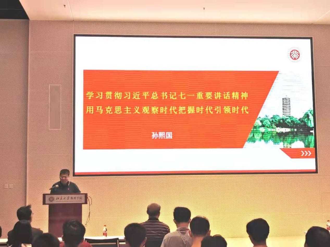 孙熙国高度评价习近平总书记站在两个“一百年”历史交汇点上的重要讲话高屋建瓴,内涵丰富,思想深邃,影响深远。随后,以“学习贯彻习近平总书记‘七一’重要讲话精神,用马克思主义观察时代把握时代引领时代”为题,从中国共产党诞生的伟大意义、中国共产党百年历程的主题、中国共产党人的历史使命、新时代的伟大宣言和号召四个方面加以阐释。