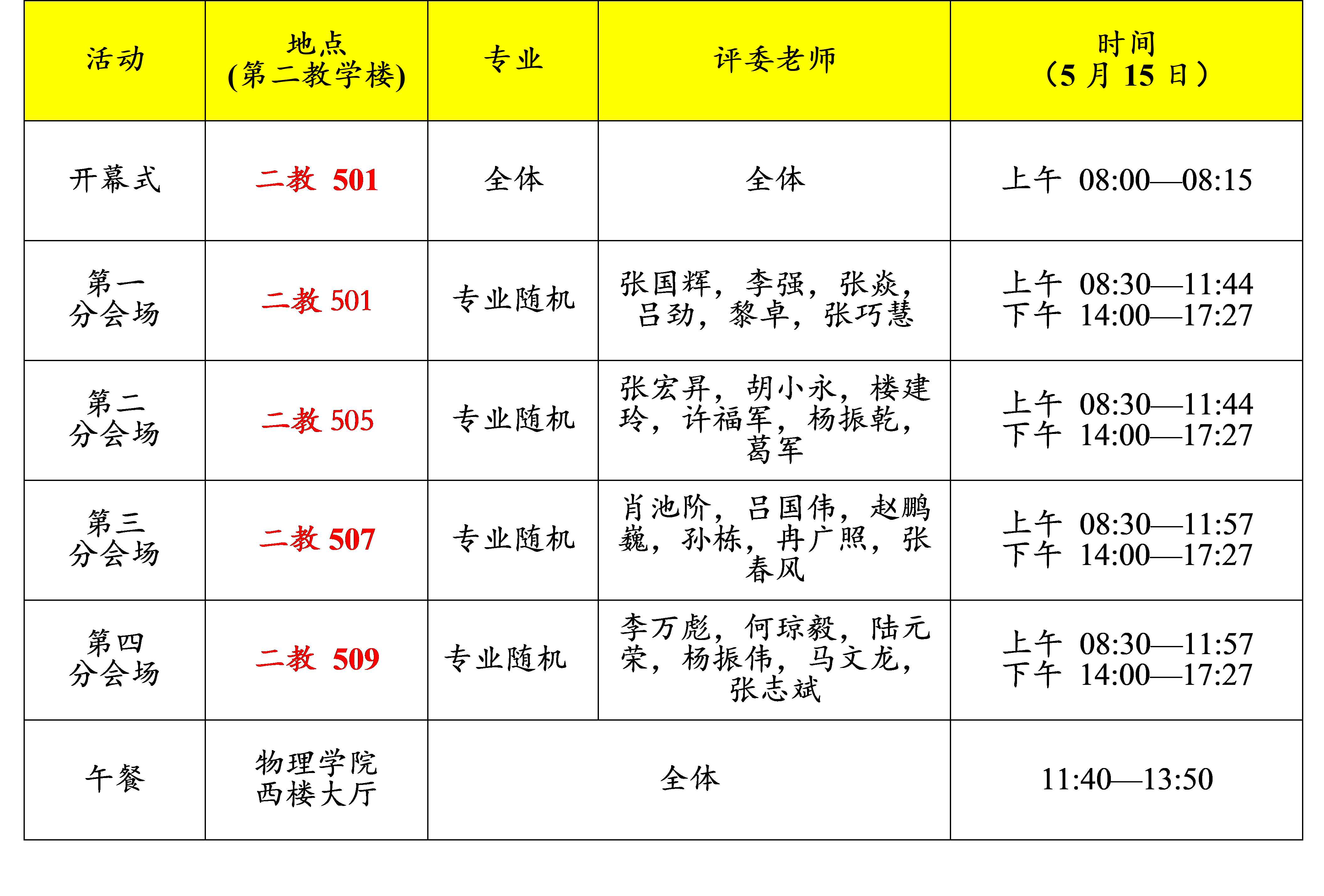 2.开幕式结束后,我们会组织大家集中合影,然后大家返回各自的分会场参与本次论坛的正式答辩评选活动。各分会场的情况如下表所示,请各位核实好自己所在会场避免走错会场。