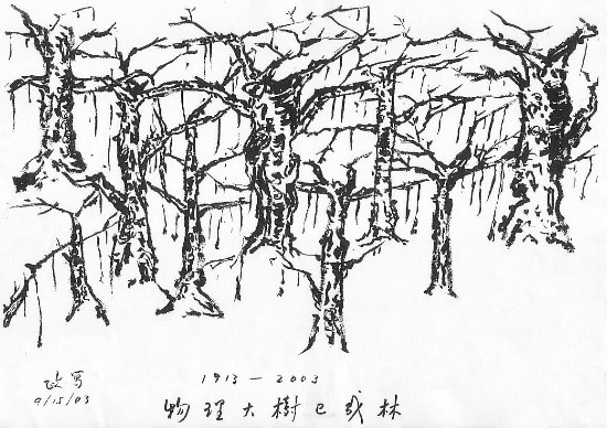 最后,在这里用李政道先生于2003年9月15日展示的硬笔画“物理大树已成林,1913—2003”作为结尾。据李先生介绍,这是他回忆往事、心潮起伏,清早起来一气呵成的画作。李先生也给大家讲解了这幅画的含义(可惜没有录音),大致是说:为九十年来中国物理建立起相互密切关联的完整体系构架和队伍支撑,感到极大的欣慰,但同时也希望未来这些树上能够花繁叶茂、硕果累累。我的理解,其中蕴含了深深的期待。毕竟,就为人类增添新的知识和科技财富而言,欧冠官方网站的同仁依然任重而道远。未来几十年应该是难得的发展机遇,还需年轻学者们新的视野、新的理解、新的创造。