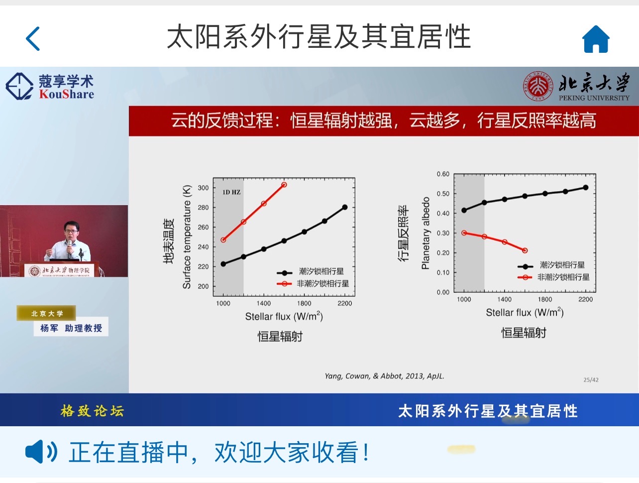 杨军首先介绍了太阳系外行星探测的当前主要成果和主要探测方法,简述了四种常见的系外行星,包括热木星、超级地球(又称迷你海王星或海洋行星)、岩浆行星和岩石行星;着重讲述了视向速度法和凌星法、行星大气成分的探测结果,以及美国国家宇航局詹姆斯·韦伯望远镜等主要国际系外行星探测计划和中国行星探测工程等我国行星探测计划。接着,重点阐明了行星宜居性和宜居带的概念,并围绕红矮星周围的行星重点论述了云、海洋和海冰对行星气候与宜居性的影响,即:云拓宽行星的宜居带,海洋影响海表温度分布和海冰的厚度,海冰流动影响冰的覆盖面积,甚至使得整个行星进入全球冰封的冰雪世界。最后,总结了以上研究成果对挑选宜居行星的决定作用,指出磁场、火山、臭氧层、风化过程等也是行星宜居性的影响因素。