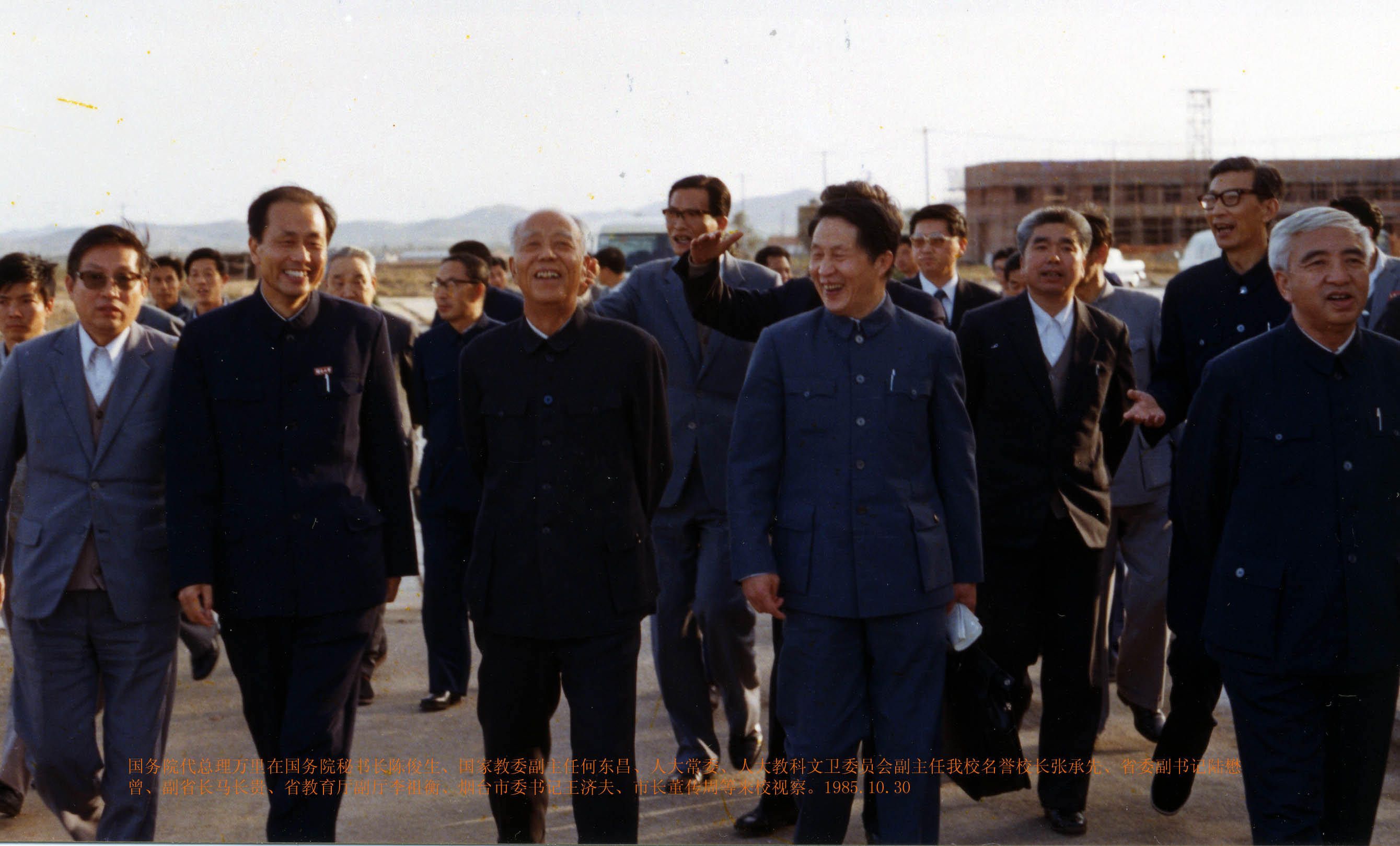 1985年10月30日,沈克琦校长(前排左四)陪同国务院代总理万里(前排左三)视察烟台大学
