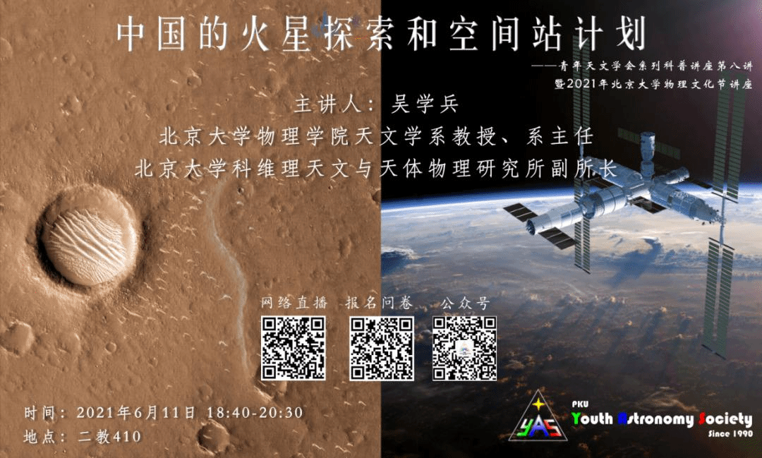 最近我国航天领域捷报频传,天问一号“祝融”号火星车成功降落火星,中国空间站“天和”核心舱和“天舟二号”顺利发射并完成对接,我国火星探索和空间站计划进入了新的阶段。本次讲座将简要介绍火星探索的历史和我国天问一号火星探索计划的进展,以及中国空间站建设的背景、计划和空间站巡天望远镜的研究能力,希望更多优秀人才投入到我国行星探索和空间科学研究中来。